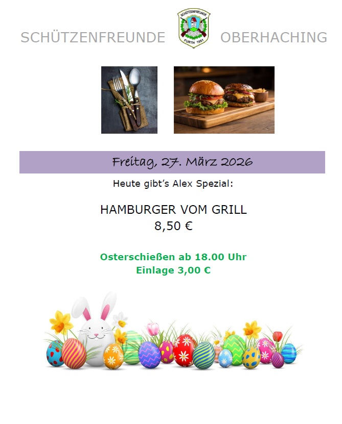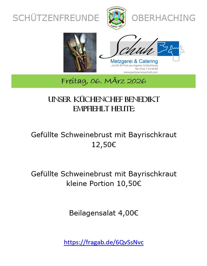 Speisekarte und Vorbestellung Vereinsabend am Freitag Liebe Schützenfreunde, hier findet ihr unsere Speisekarte für den nächsten Vereinsabend: Zur Vorbestellung bitte auf die Speisekarte klicken.